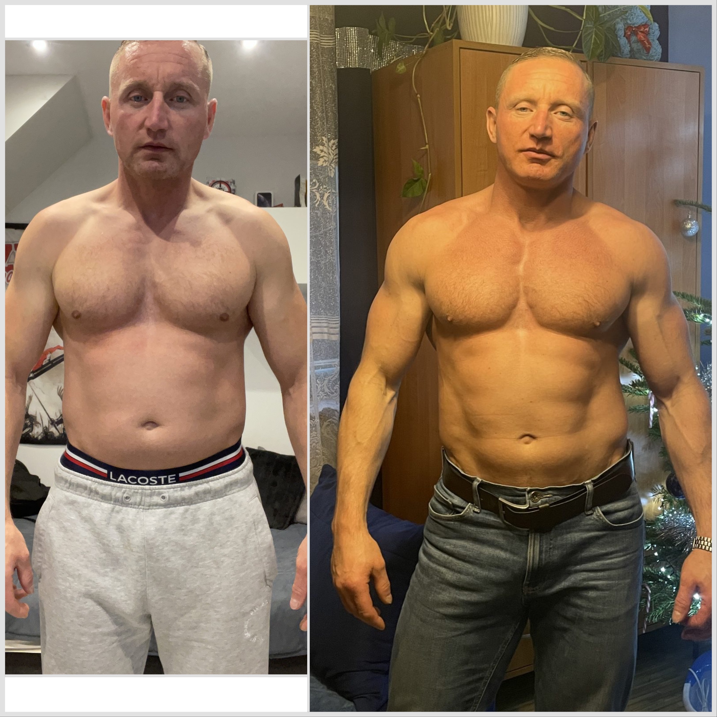 Piotr pomimo ciężkiej pracy fizycznej postanowił zmienić swoje ciało. Współprace online zaczęliśmy niecałe 13 miesięcy temu. w tym czasie realizował moje treningi i dietę Oli we własnym zakresie. Efekty jego pierwszych 9 miesięcy transfomracji widzicie na zdjęciu.
